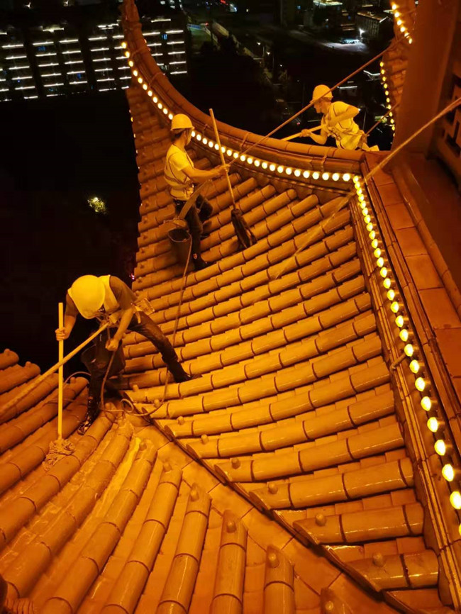 為了不影響白天游客的正常游玩,我們的外墻清洗師傅們選擇在夜間施工,實現(xiàn)了對游客完全的零打擾服務,但同時也對此次的清洗作業(yè)帶來了一定難度。